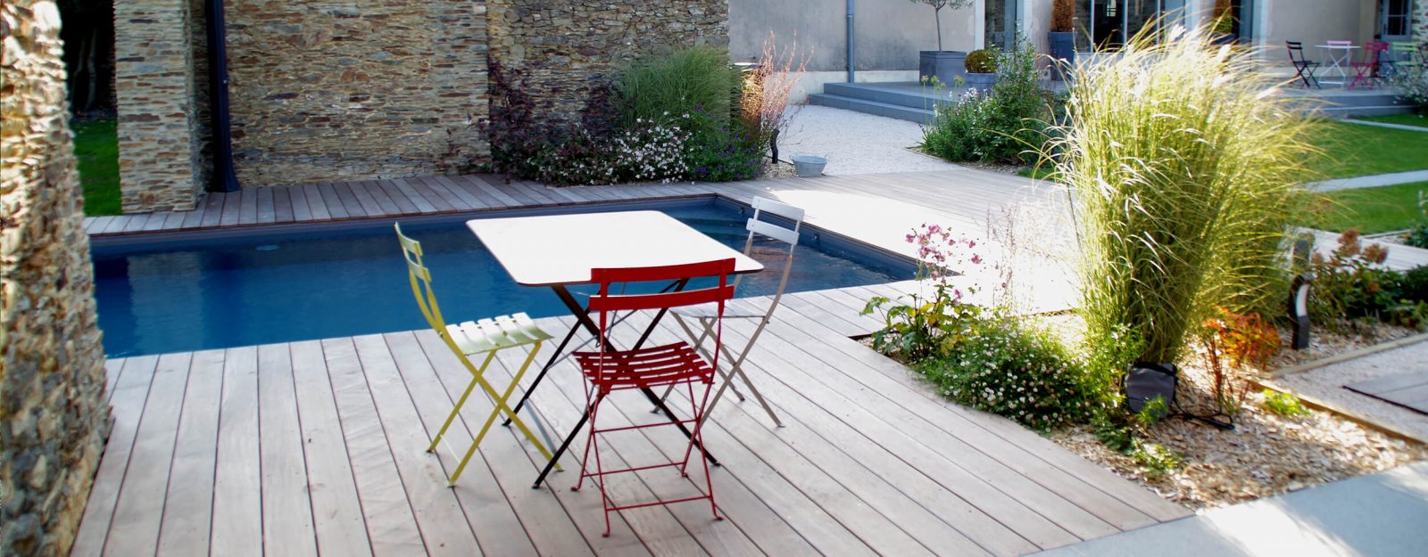 Véritable marque de fabrique, Verthème joue avec élégance sur l’alliance des matériaux permettant ici de délimiter et de créer du contraste entre les différentes zones de vos espaces extérieurs.